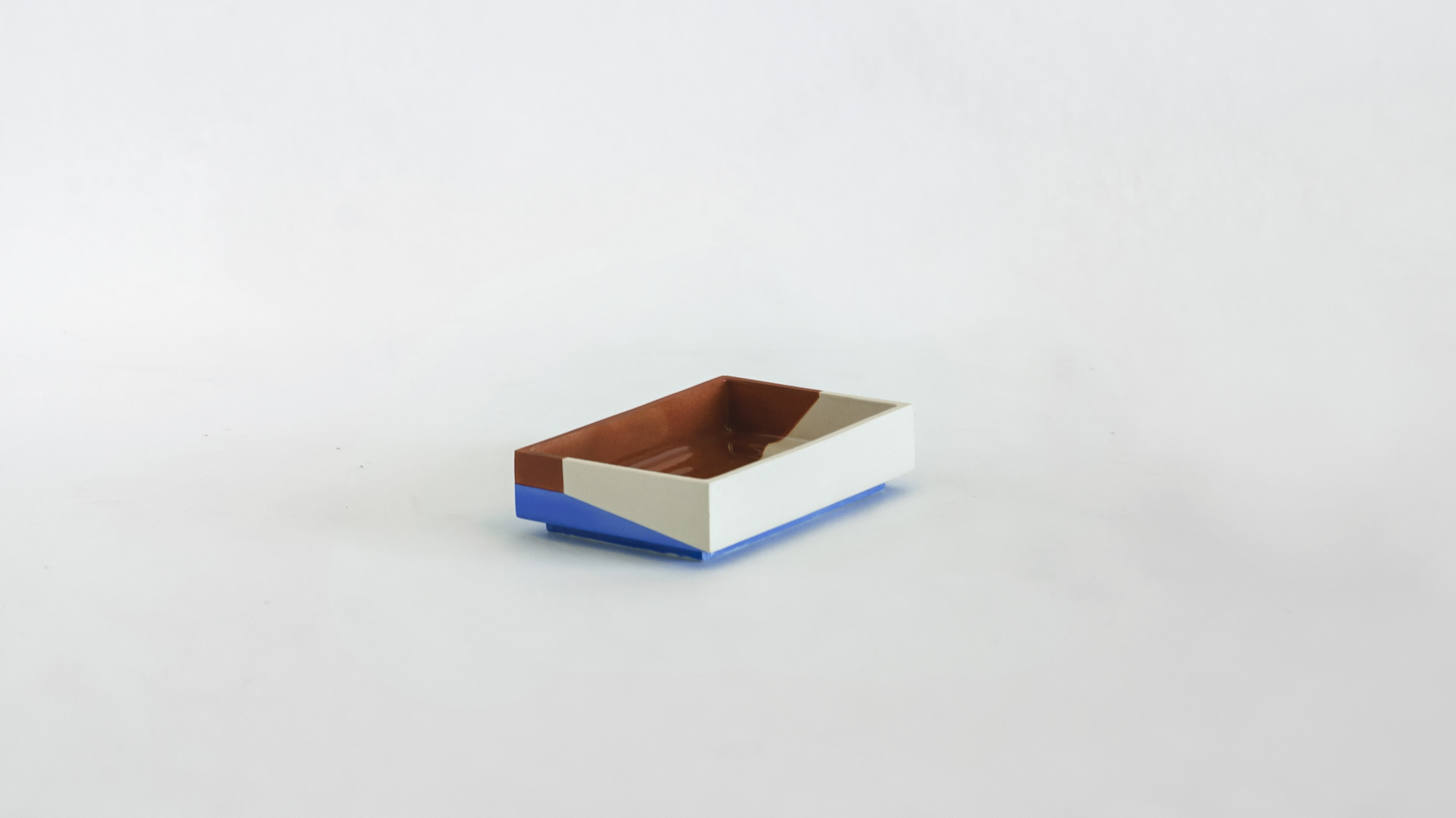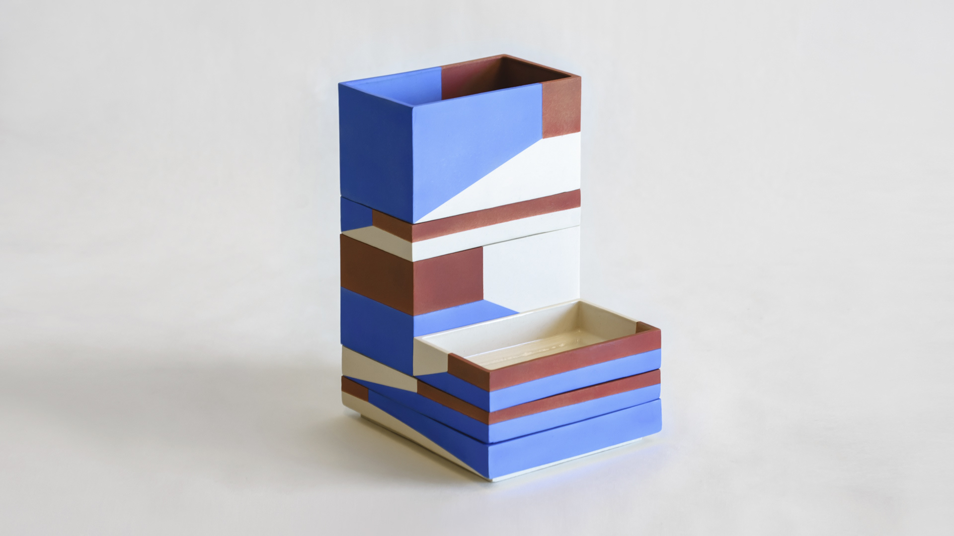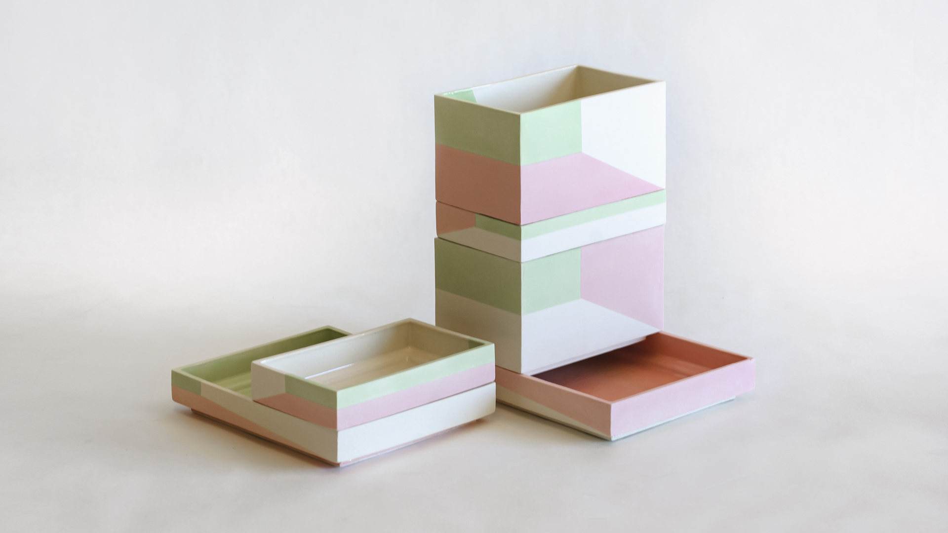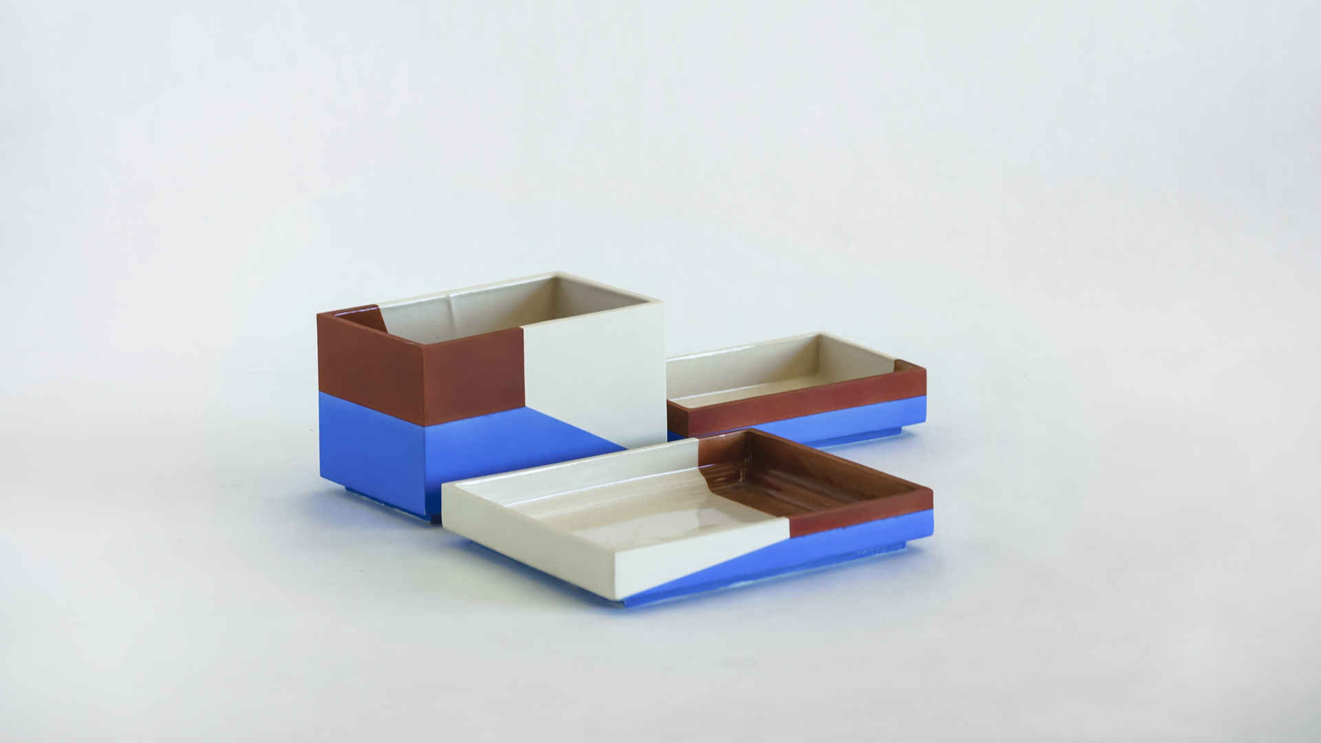 This limited collection of modular slip-cast ceramic vessels was the culmination of research into simple, stackable, ornamental forms. The motif was inspired by flat modernist representations of linear perspective, as well a study of the color-to-surface explorations in the De Stijl.